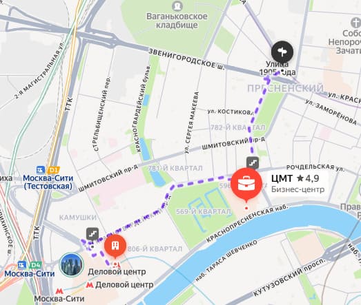Выход из метро к ул. Красная Пресня, далее следовать по ул. 1905 года. Расстояние до ЦМТ примерно 1,2 км – около 15 минут пешком.