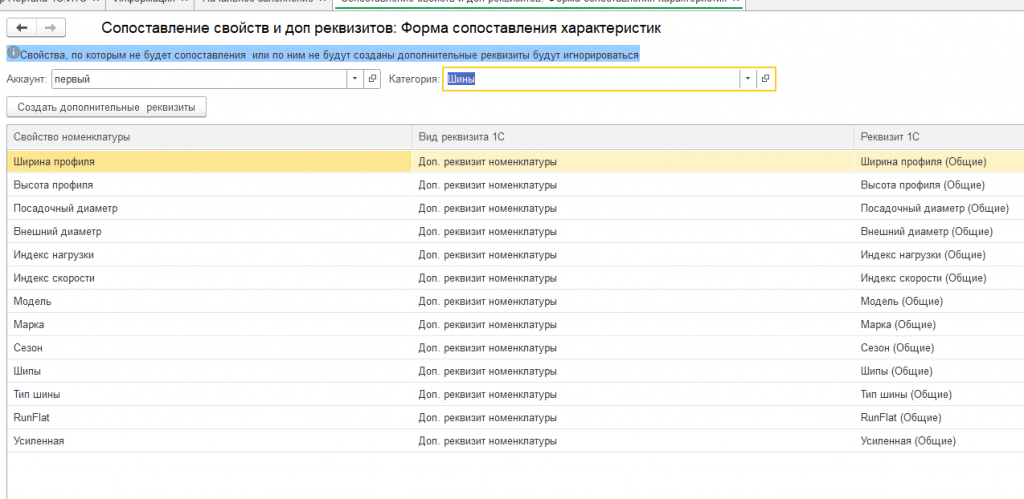 - автосоздание свойств (в дополнительные реквизиты справочника Номенклатуры)