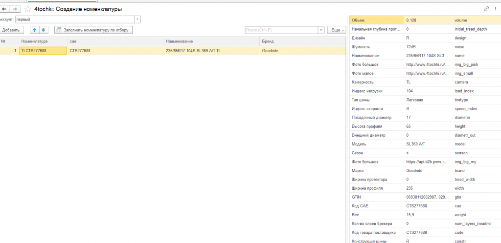 Расширение адаптировано для конфигурации 1С:УТ 11 и предназначена для заполнения вашей базы данных товарами и сопутствующей информацией, получаемой с ресурса «Форточки» - автоматизированная платформа закупок шин, дисков.