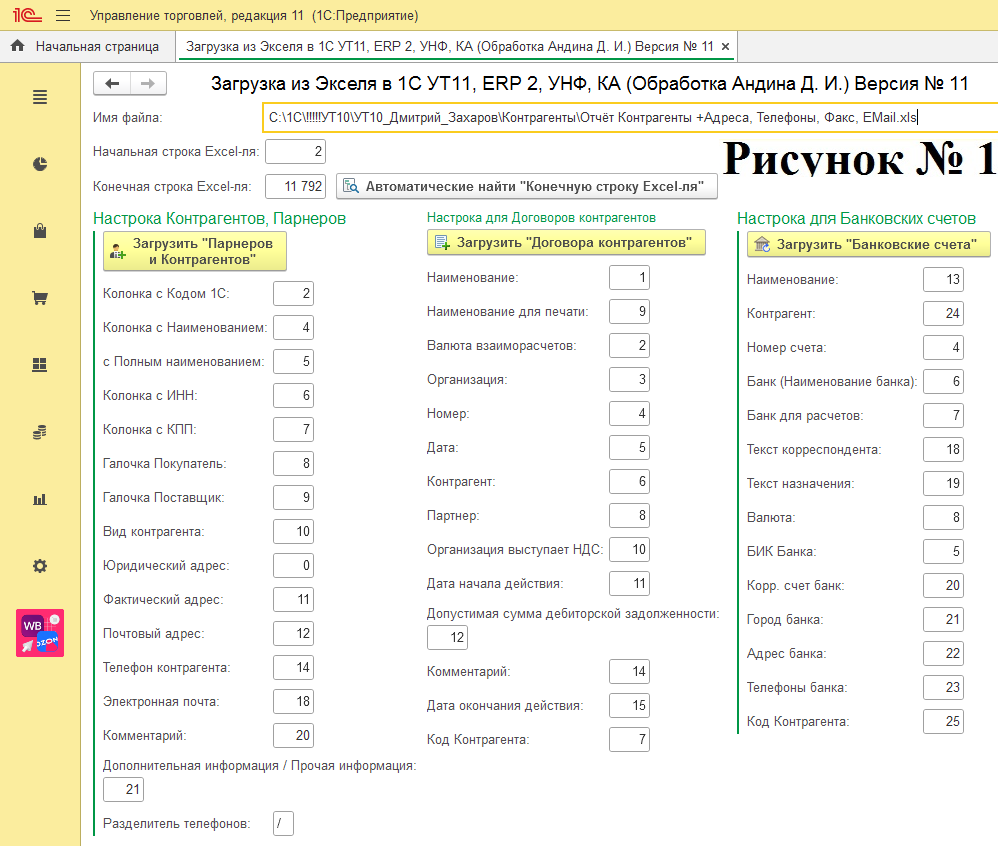 Загрузка Контрагентов Партнеров Из Эксель (версия 11).epf - обработка, загружает справочник Контрагентов, Партнеров, справочник Договоры контрагентов, справочник Банковские счета (Рисунок № 1)