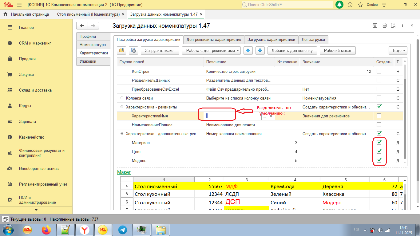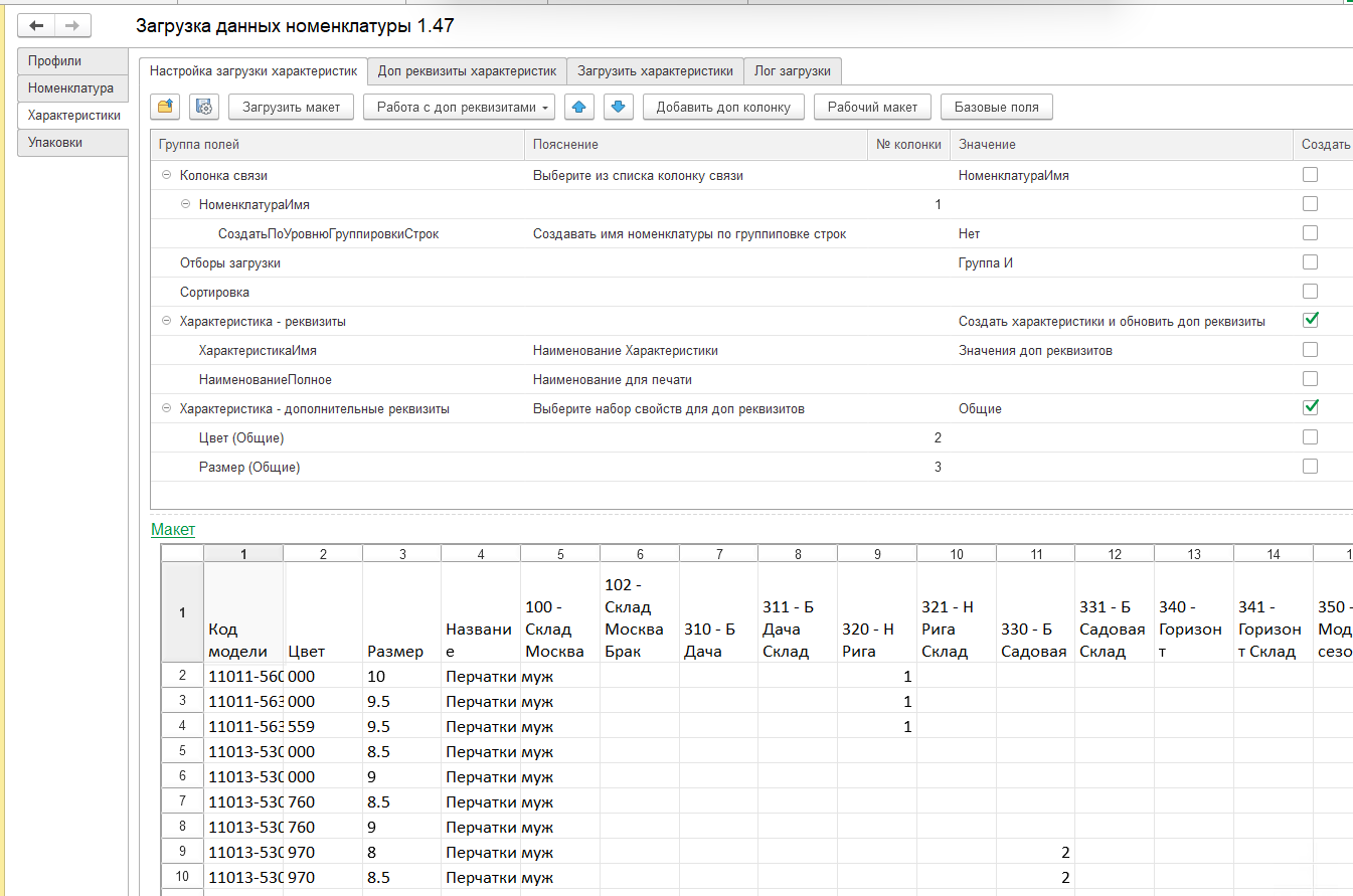 - Реализована загрузка характеристик номенклатуры по данным доп реквизитов файла загрузки с генерацией имени характеристики по значениям реквизитов.