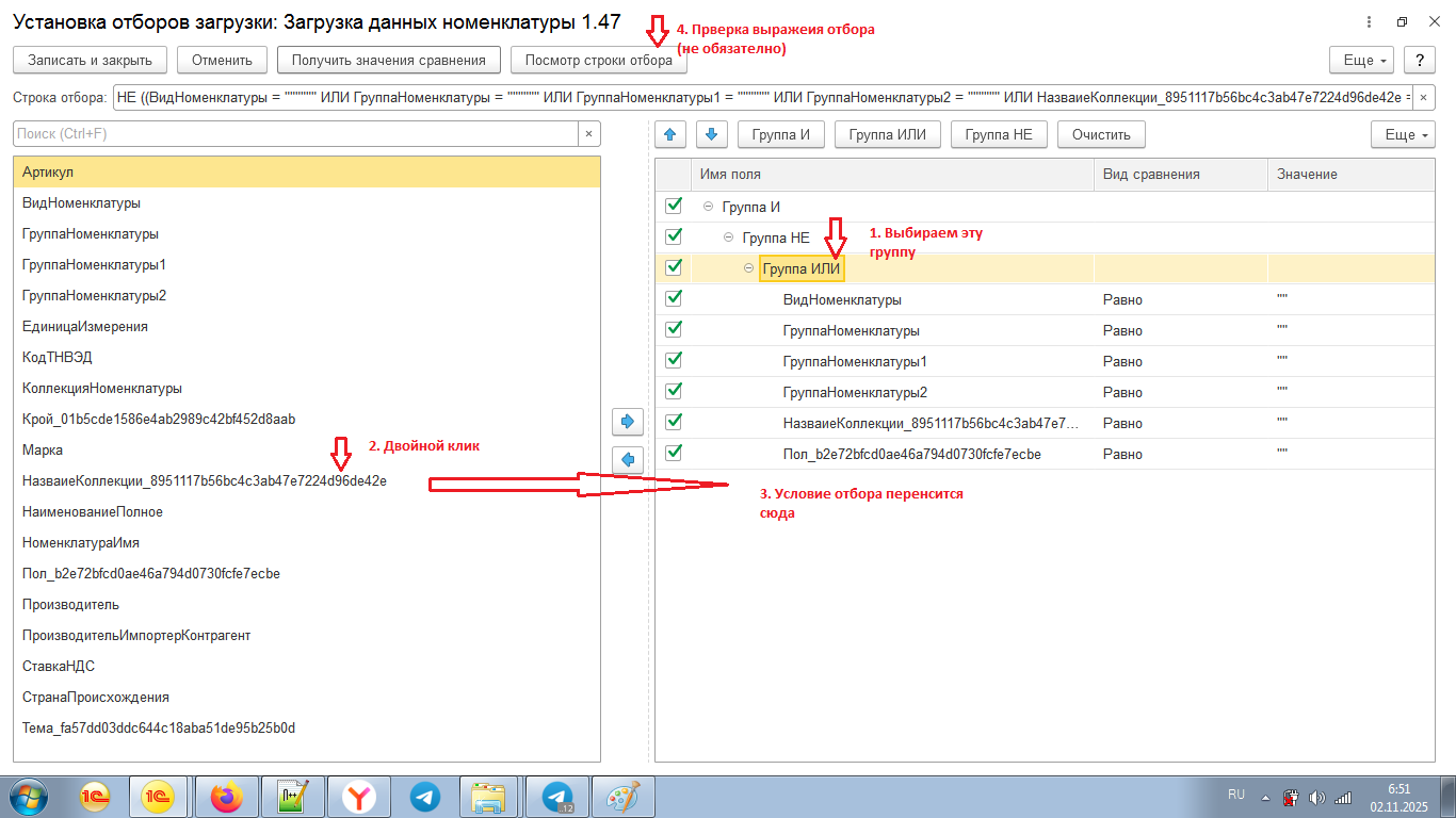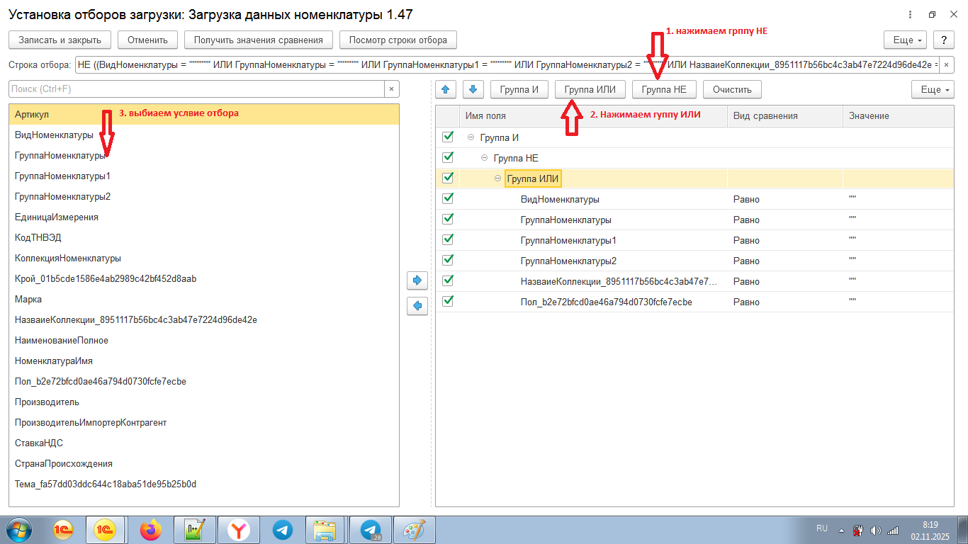 - «Реквизиты номенклатуры» - предназначена для переноса выбранных реквизитов номенклатуры в настройку загрузки;