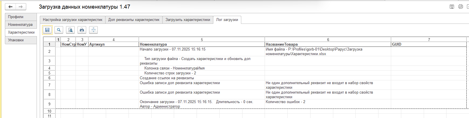 - Реализована возможность анализа загружаемых данных перед загрузкой номенклатуры.