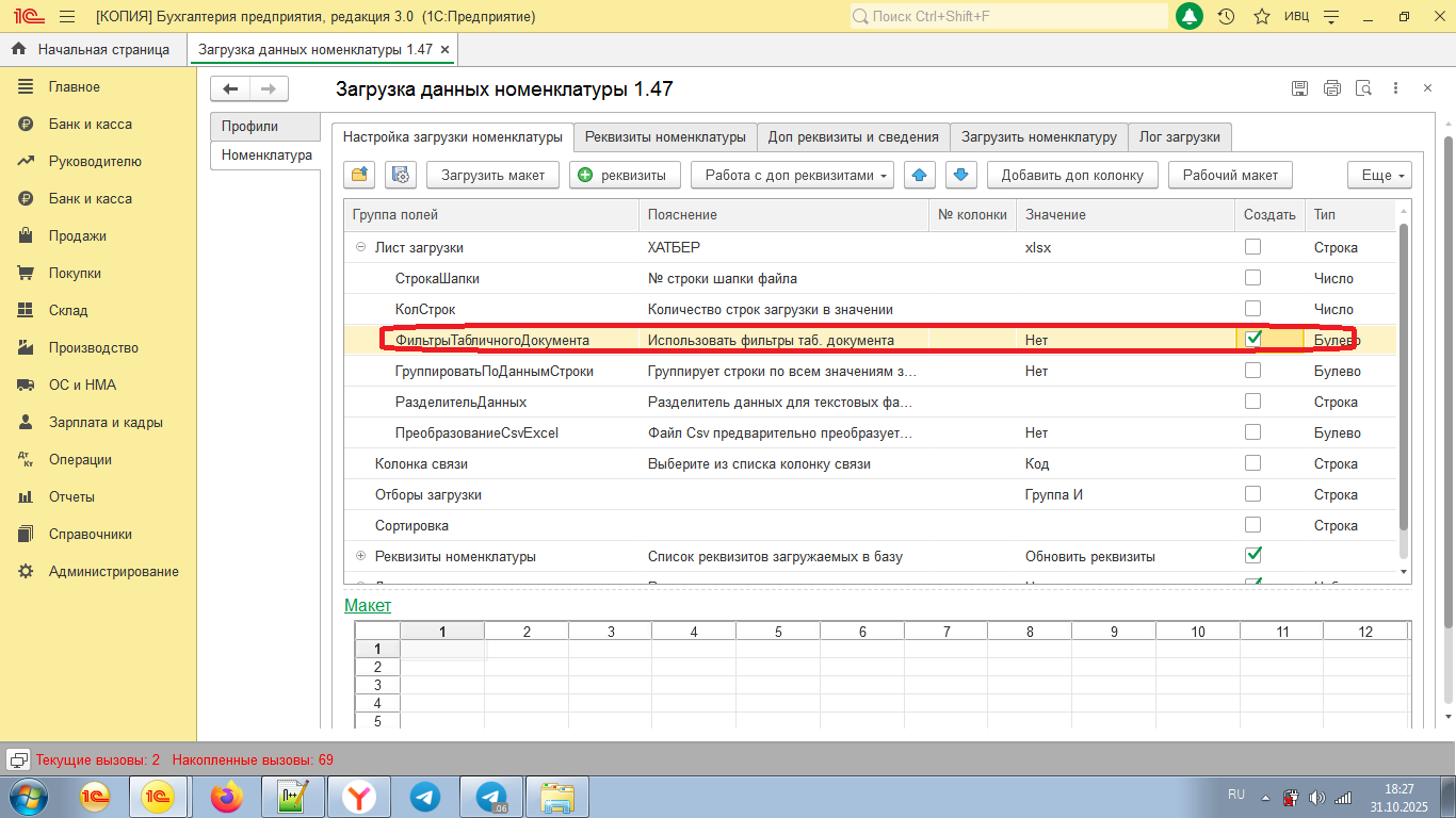 - Номер строки шапки является не обязательным. Если номер строки шапки не указан, то в первой строке шаблона загрузки будет сформирована строка шапки с наименованиями колонок взятым из колонки группа реквизитов настройки загрузки. Проверить формирование можно нажав кнопку "Рабочий макет".