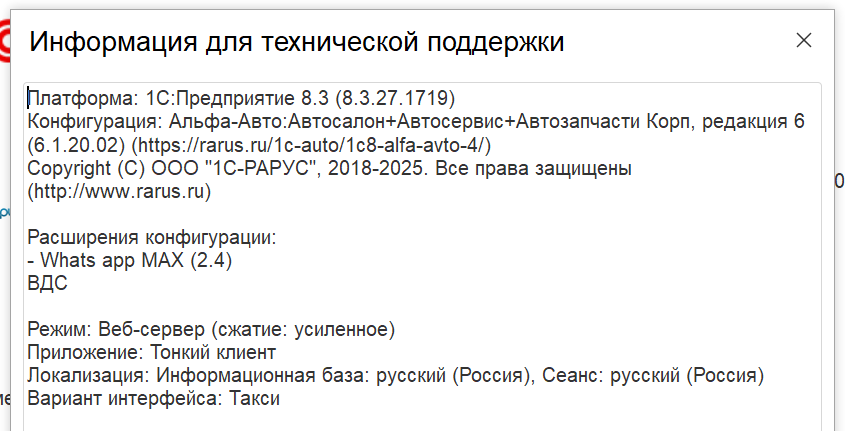 - 1С:Рарус Альфа-Авто: Автосалон+Автосервис+Автозапчасти. Редакция 6. Для версий младше 6.1.10 (БСП версии 3.1.6) недоступна кнопка открытия чата из формы Контрагента, возможна донастройка