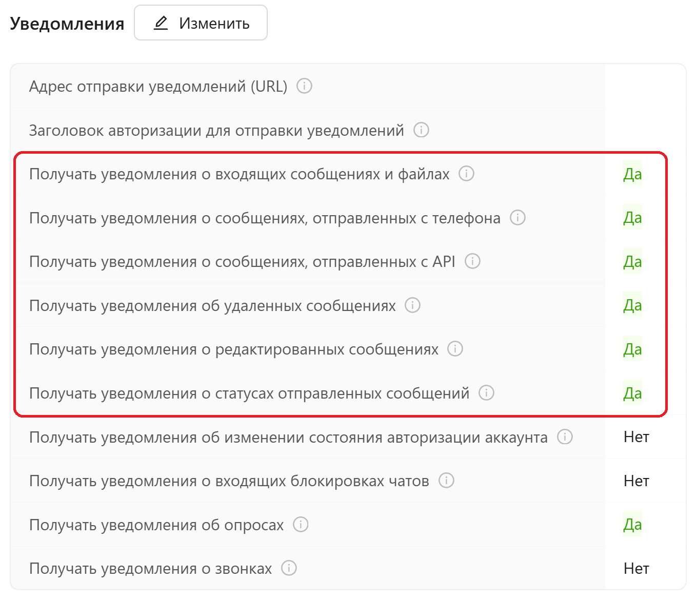 - Для получения сообщений и статусов отправленных сообщений в л/к green-api выполнить настройки: