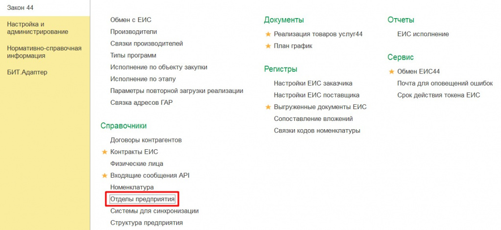 В разделе «Справочники» выберите пункт «Отделы предприятия».
