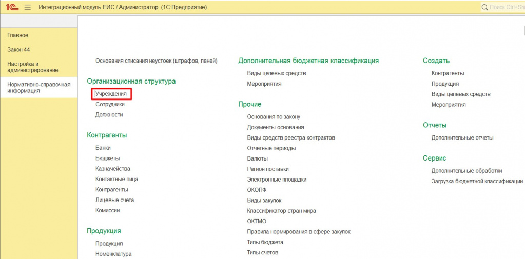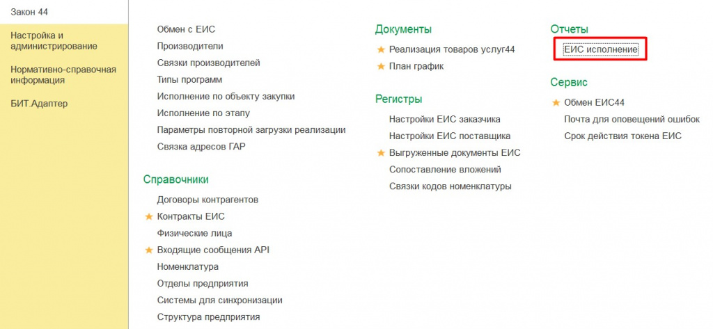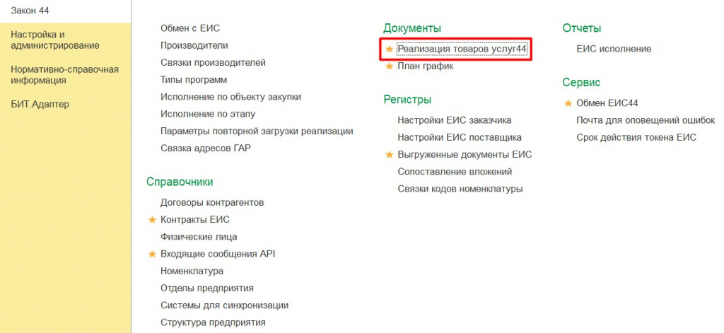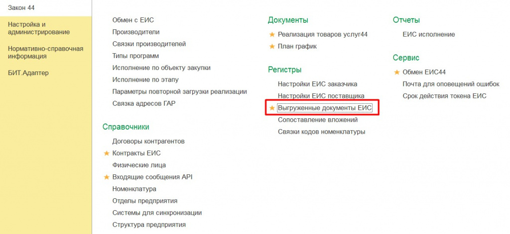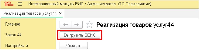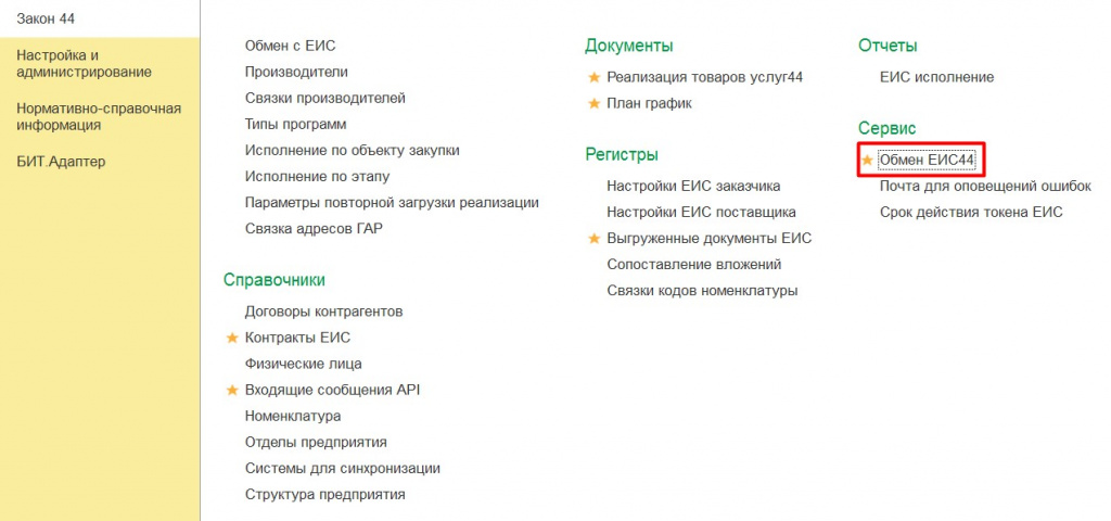 Следующим шагом в разделе «Сервис» открываем обработку «Обмен ЕИС44».