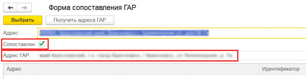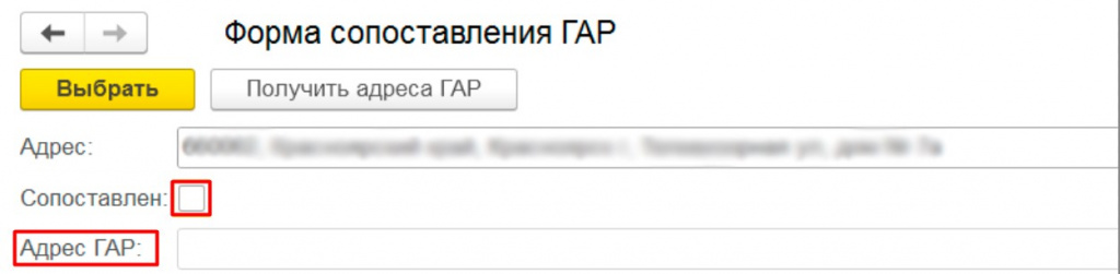 В форме сопоставления не горит маркер «Сопоставлен» и поле «Адрес ГАР» пустое. Необходимо сопоставить адрес.