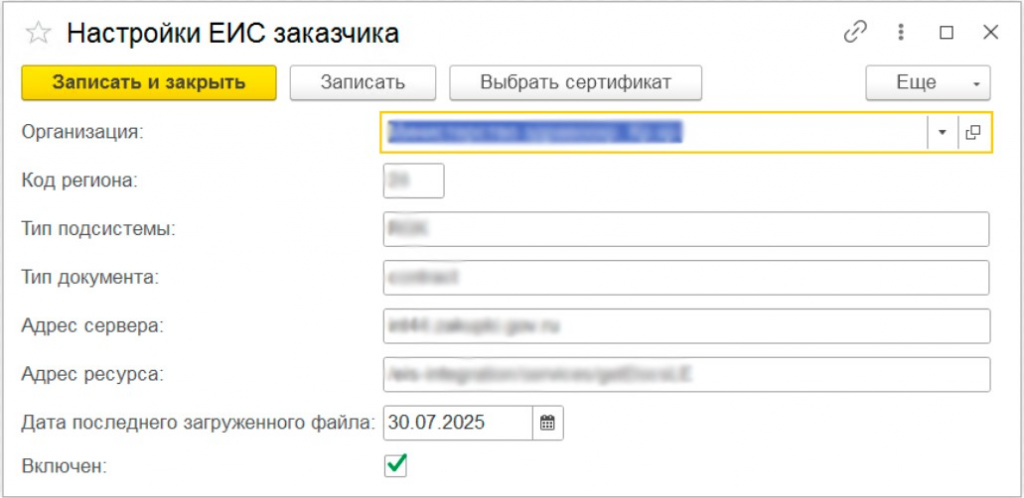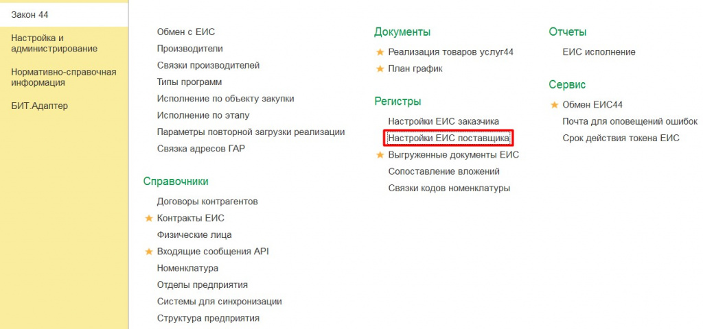 Для первичной настройки требуется в разделе «Регистры» выбрать «Настройки ЕИС поставщика» и создать запись с данными вашей организации.
