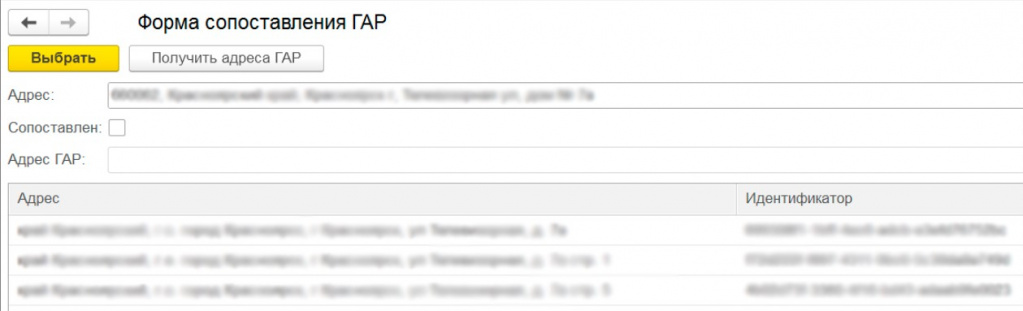 После нажатия на кнопку «Получить адреса ГАР» должен появится список адресов и их идентификаторов.