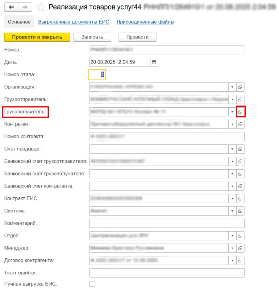 Откройте нужный документ. И проваливаемся в пункт «Грузополучатель».