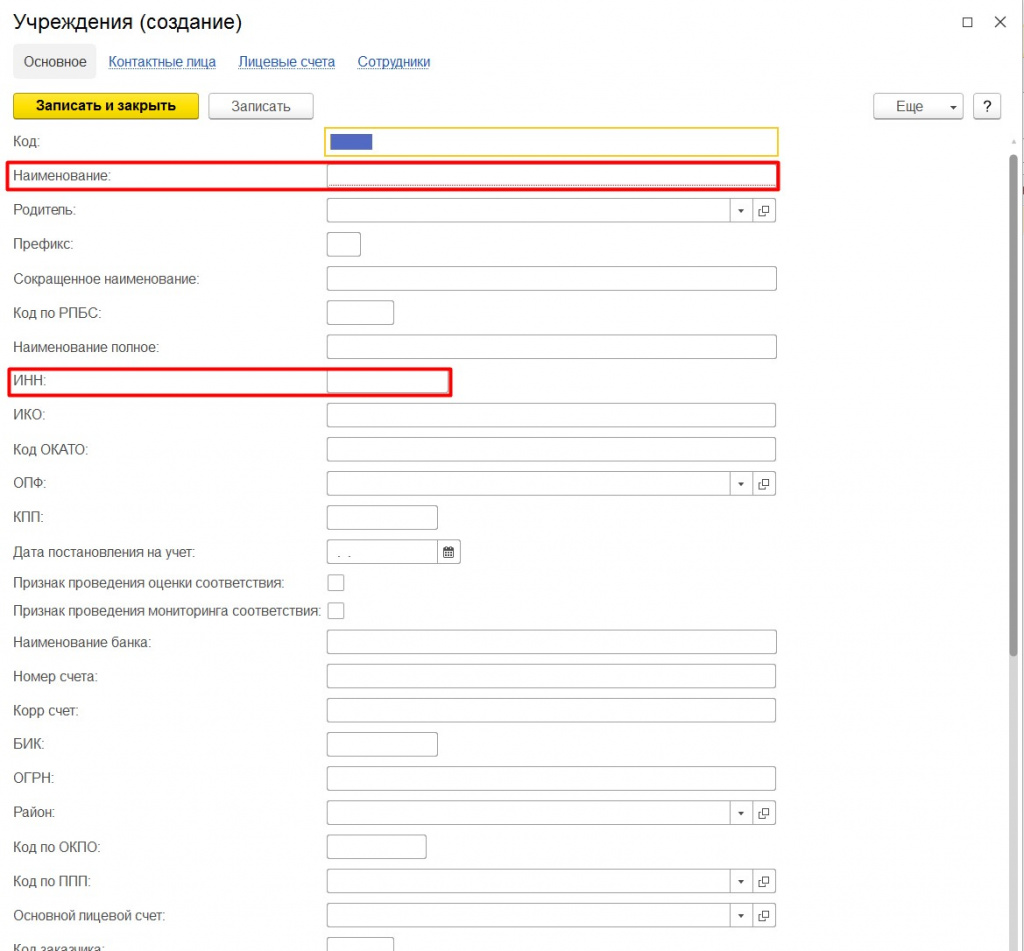 После нажатия кнопки «Создать» открывается форма «Учреждения (создание)». Во вкладке «Основное» необходимо заполнить следующие поля: