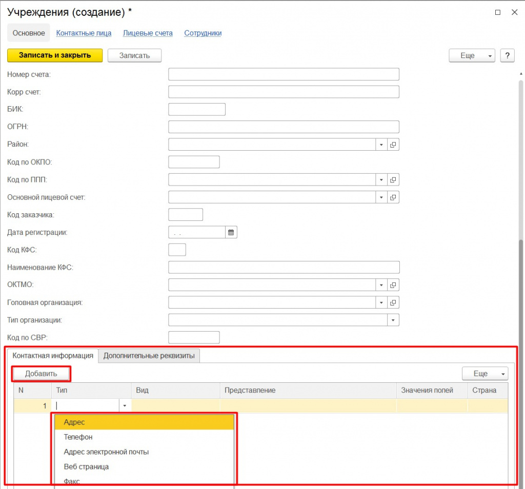 Чтобы заполнить контактную информацию, нажмите на кнопку «Добавить» и выберите нужное поле из всплывающего списка для колонки «Тип», далее заполните другие колонки для каждого типа.