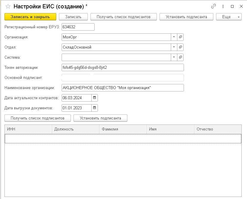 В «Настройки ЕИС (создание)» необходимо заполнить данные о вашей организации: