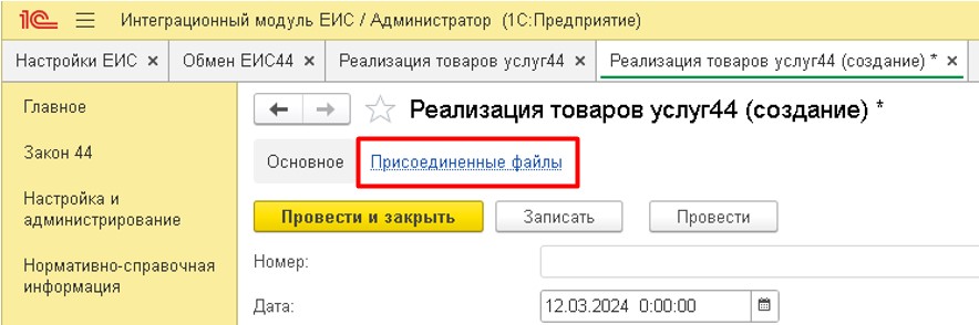 После того, как загружены контракты можем создавать документ «Реализация товаров услуг44».