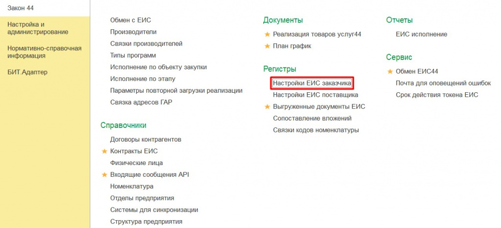 Для первичной настройки требуется в разделе «Регистры» выбрать «Настройки ЕИС заказчика».