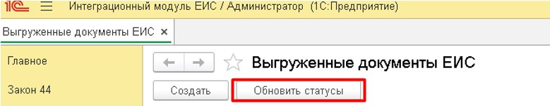 После выгрузки документа потребуется получать его статус в системе ЕИС, это можно произвести, зайдя в регистр «Выгруженные документы ЕИС» и нажав кнопку «Обновить статусы».