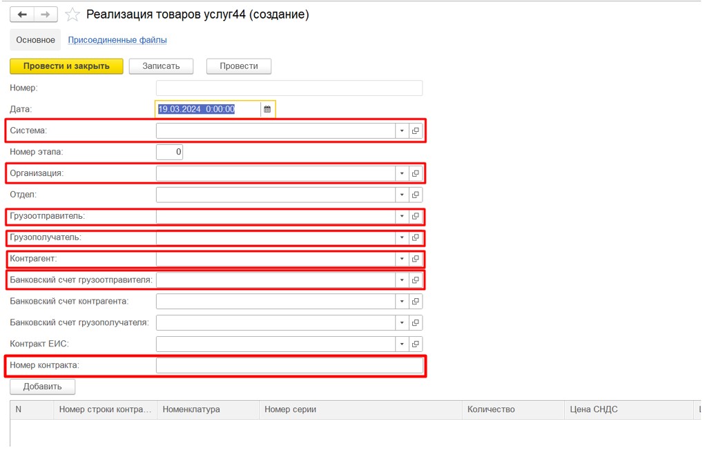 Поле «Контракт ЕИС» будет заполняться в момент проведения. Система будет искать его в справочнике «Контракты ЕИС» с отбором по номеру договора и ИНН заказчика, также будут сопоставляться строки таблицы товаров и, при успешном сопоставлении, заполнится колонка «Номер строки контракта».