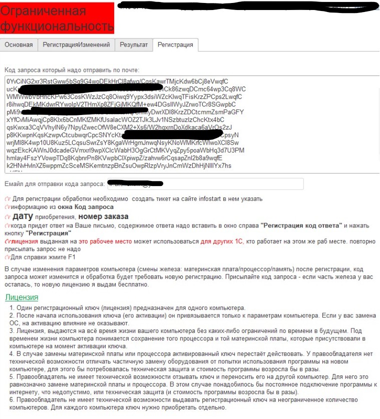 - В случае изменения параметров компьютера вы присылаете новый код запроса (номер заказа Инфостарт и дату покупки). Если произошла частичное обновление «железа», то регистрационный ключ (лицензия) выдается бесплатно
