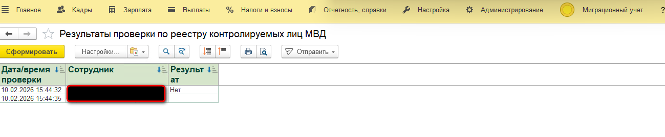 Запрос может быть отправлен точечно (по выбранному сотруднику) либо по расписанию в фоновом режиме. Результаты проверки сохраняются в карточке сотрудника.