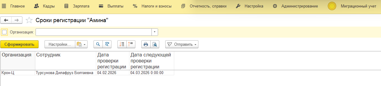 Добавлена возможность вести учёт регистрации Амина иностранных сотрудников. В карточке физического лица отражается статус регистрации, срок действия и при необходимости — автоматическое уведомление о приближении окончания срока.