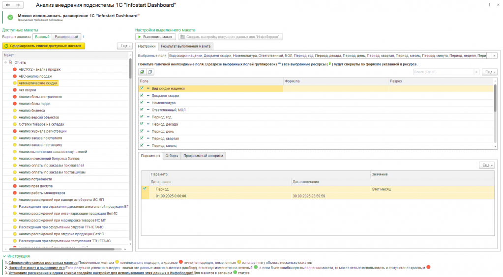 Если отчет доступен в "Анализ внедрения подсистемы 1С Infostart Dashboard" в базовом варианте анализа, то сможете самостоятельно выбрать данные для визуализации (требуется продвинутый пользователь по настройке отчетов). - Нужен если вы хотите строить графики, выводить показатели или индикаторы, а для визуализации нужно опираться на информацию из отчетов или на другие данные в системе, которые может вытащить только программист.