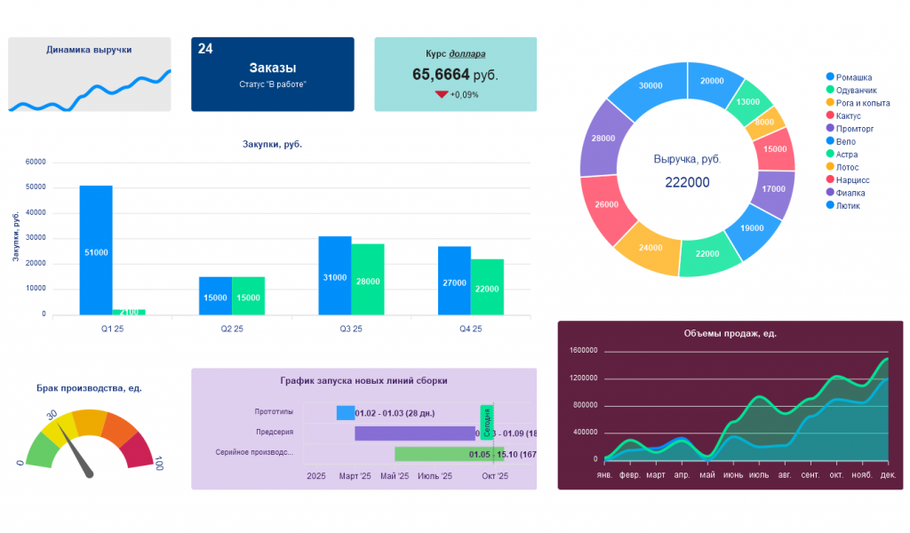 - Для руководителей: поможет отслеживать необходимые данные системы на одном экране (показатели, индикаторы, диаграммы), это упрощает анализ информации и ускоряет процесс принятия управленческих решений.