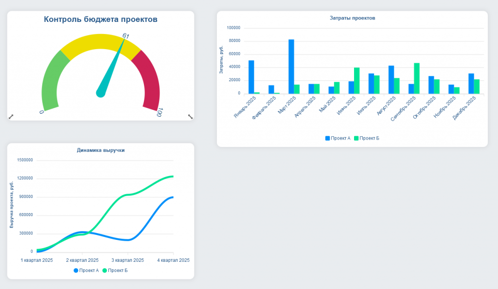 Подсистема позволяет следить за бюджетом, расходами, выручкой, состоянием проектов и другими параметрами.