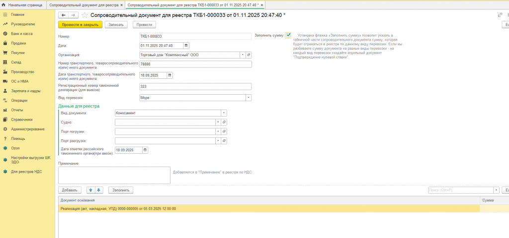 Заполняете новый документ «Сопроводительный документ». В табличной части выбираете реализацию товаров и услуг. Нажимаете кнопку заполнить, в документе заполнятся данные, которые были введены в счет на оплату на этапе 1. Оставшиеся данные заполняете из первичных документов.