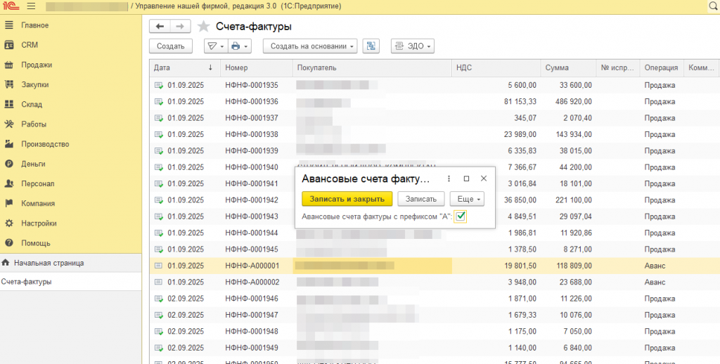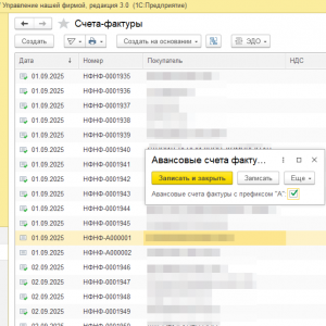 Типовая УНФ не позволяет использовать отдельную нумерацию авансовых счетов-фактур. Из-за этого появляется разница между номерами реализаций и счетов-фактур, что создаёт многочисленные неудобства.