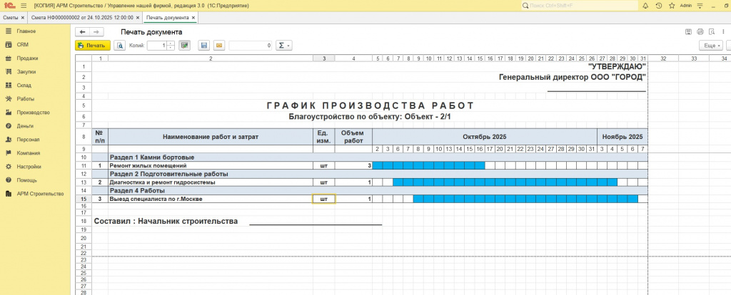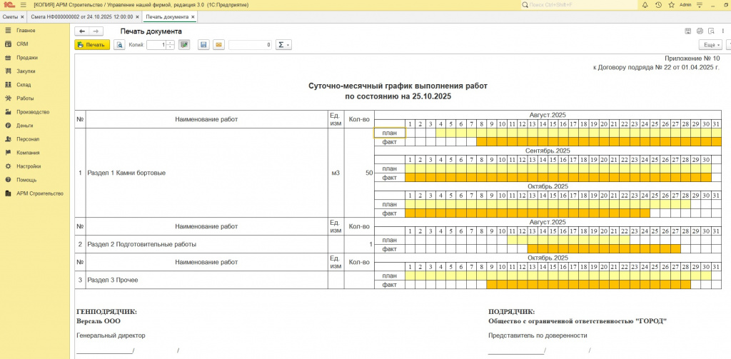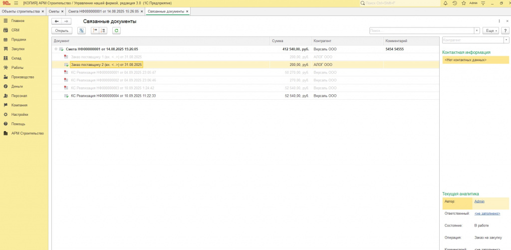 На закладке "Работы" для каждого вида работ можно указать "Сроки выполнения работ" на основании которых формируется печатная форма из сметы "График производства работ" по месяцам. При поступлении материалов можно указать по какому заказу поставщику пришел материал, для одной строки документа поступления можно указать несколько заказов поставщику.