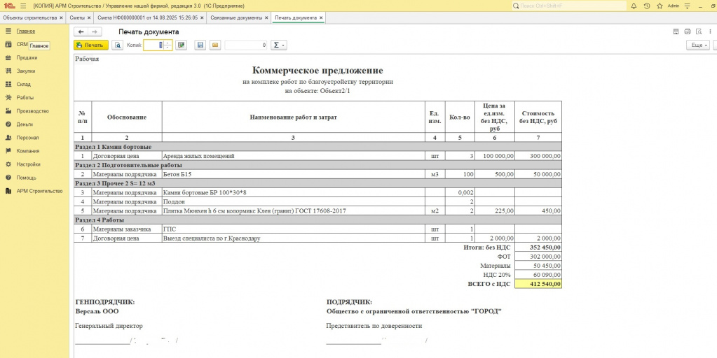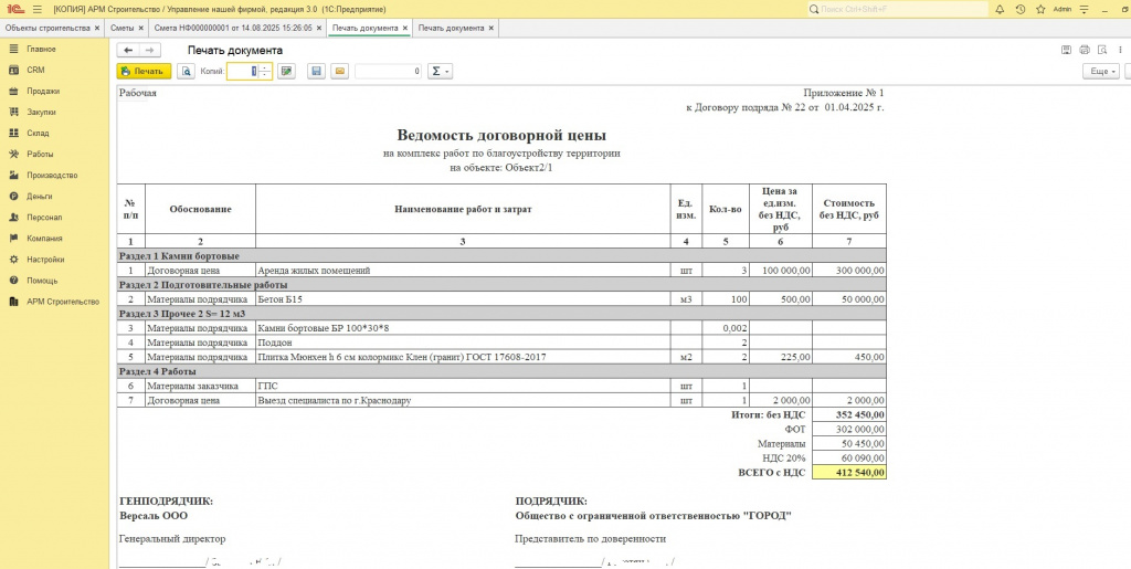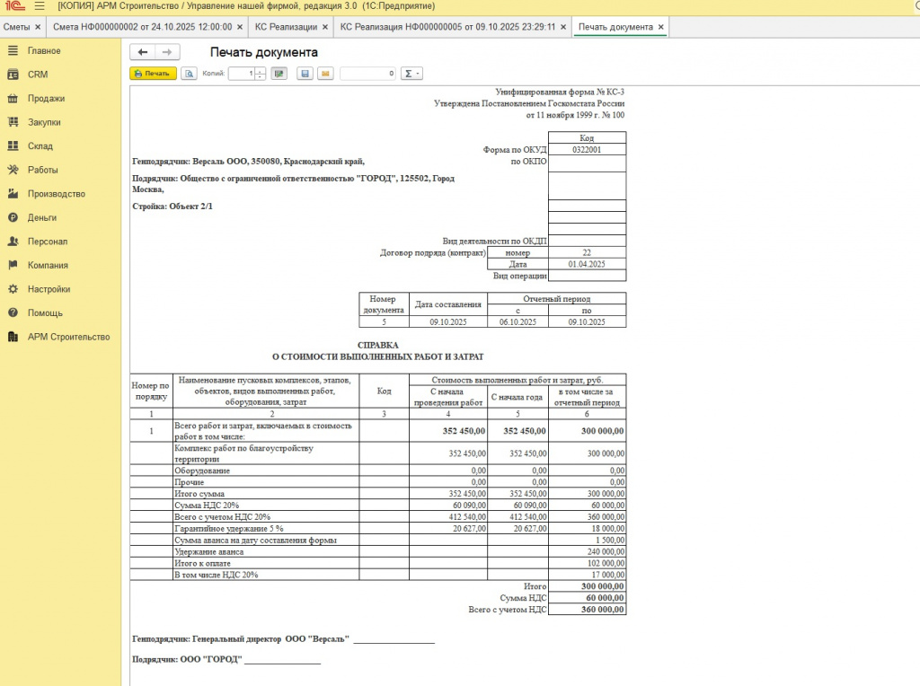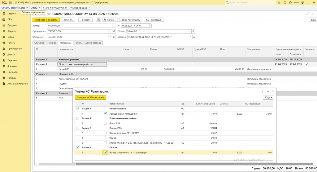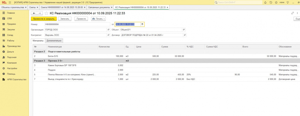 На основании сметы можно создать документ "КС Реализация", он также формируется по разделам - из него формируется печатные формы "КС-2" и "КС-3"