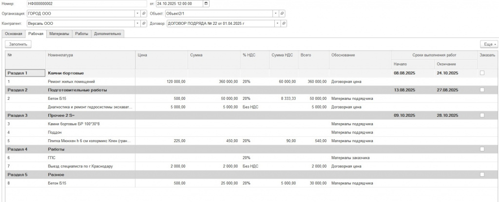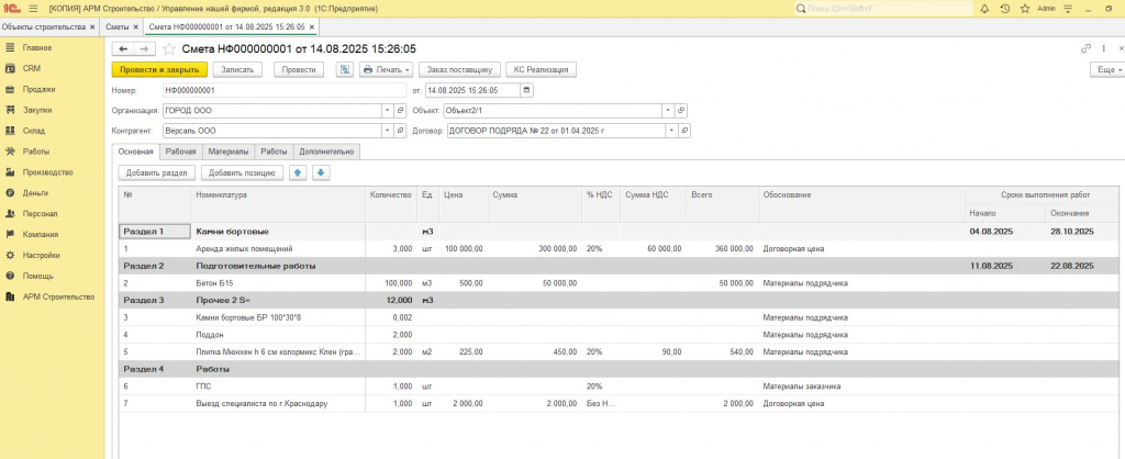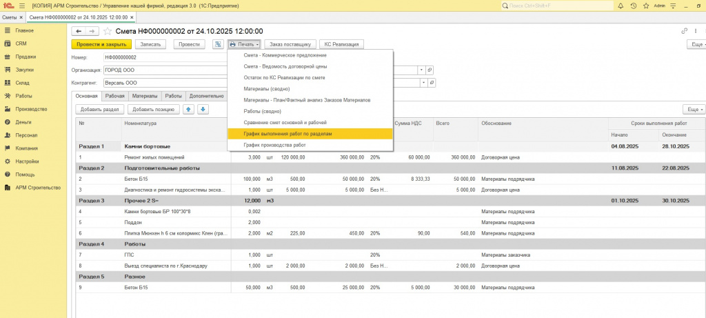 3. Отдельно в смете выделяются при записи в отдельные закладки Материалы и Работы, на каждый раздел можно указать "Сроки выполнения работ".