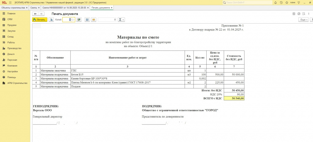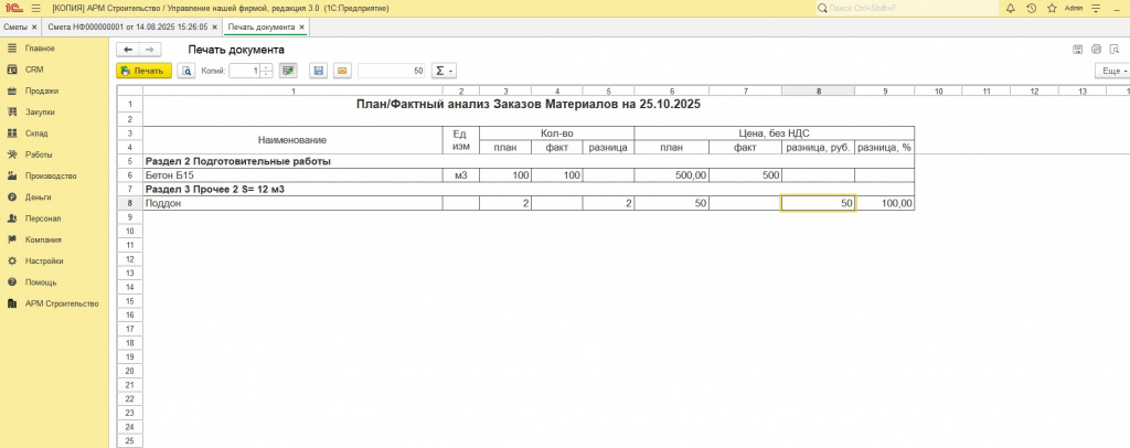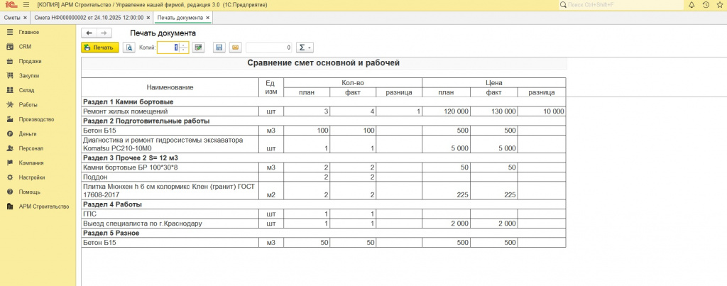 Из сметы можно сформировать печатные формы: "Коммерческое предложение", "Ведомость договорной цены", "Материалы по смете", "План/Фактный анализ Заказов Материалов", "Работы по смете", "Суточно-месячный график выполнения работ", "График производства работ", "Остаток по смете", "Сравнение смет основной и рабочей"