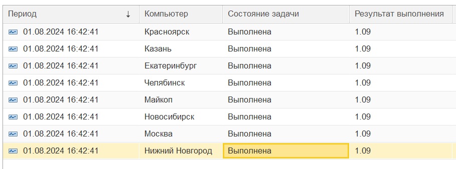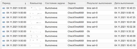 Привожу обезличенную картинку реальной работы. В колонке «Результат» — «Ок», если синхронизация не требовалась, «time set=0» — если была выполнена. Все результаты проверок и исправлений по каждому компьютеру будут в вашей базе 1С. Дата выполнения как видите везде разное, так как компьютеры были включены в это время. Вам не нужно беспокоиться включен компьютер сейчас или нет, есть у него сейчас интернет или какие-то проблемы.