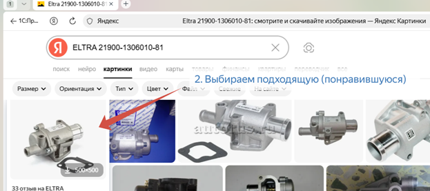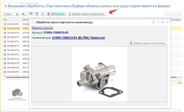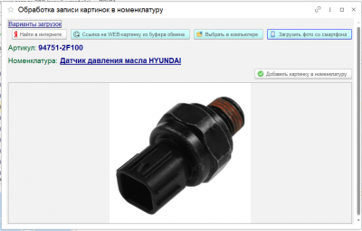Наш Бот при автозаписи новой номенклатуры проверяет наличие картинок этих товаров в информации, заранее предоставленной многими производителями, и при наличии соответствующей по параметрам — сразу добавляет её во вновь созданный элемент справочник.