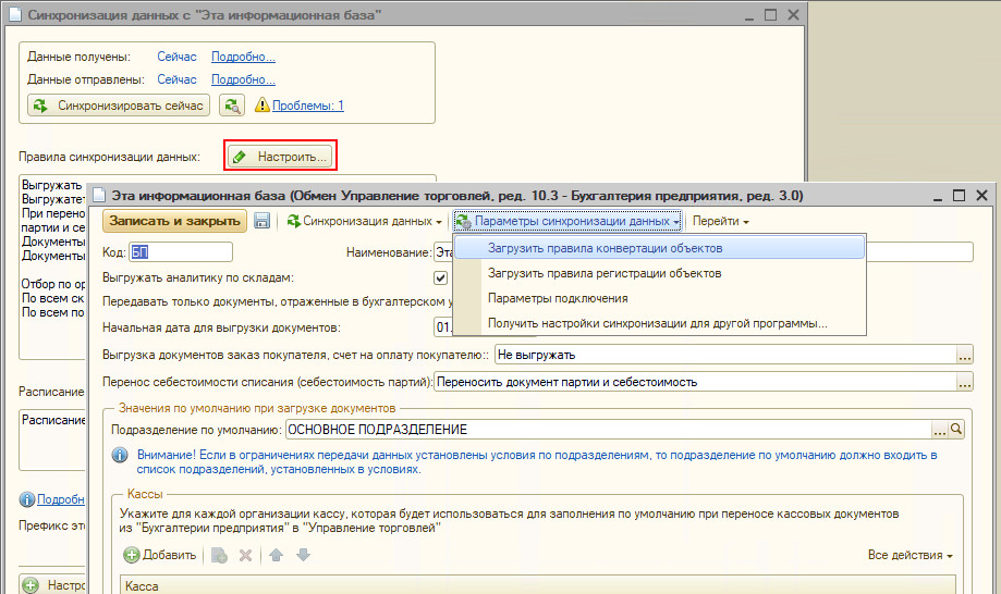 Если у Вас одна настройка обмена, то нажимаем кнопку "Настроить..." откроется форма настройки. В ней на командной панели открываем список меню "Параметры синхронизации данных" - "Загрузить правила конвертации объектов".