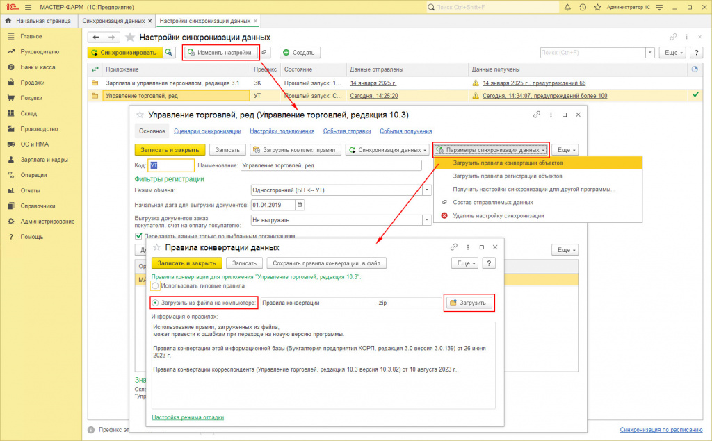 Рис. 2. Переход к загрузке правил конвертации объектов в базе Управление торговлей 10.3
