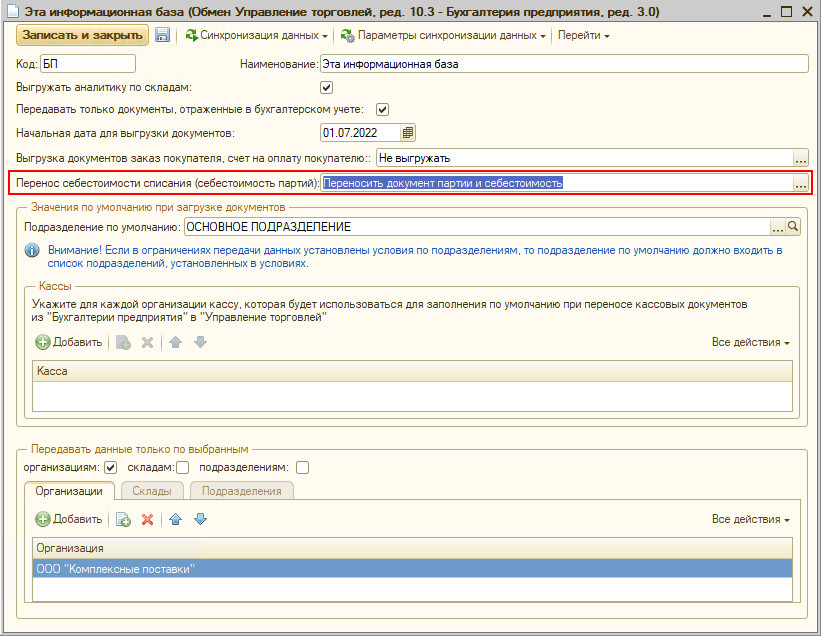 В текущих правилах обмена/выгрузки учтена выгрузка "Себестоимости" для документа "Комплектация номенклатуры", что было не реализовано разработчиками, когда в настройках обмена установлено "Перенос себестоимости списания (себестоимость партий)" в значение "Переносить документ партии и себестоимость".