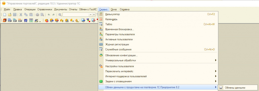 Переходим в меню "Сервис" - "Обмен данными с продуктами на платформе 1С:Предприятие 8.2" - Обмен данными