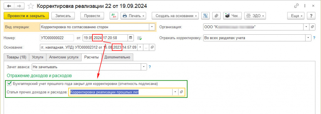 Так как реквизита документа нет в базе УТ, то при выгрузке, если год документа "Корректировка реализации" отличается от года документа - "Основание", то автоматически будет установлен флажок и правила выгрузки попытаются подобрать статью справочника "Прочие доходы/расходы" - "Корректировка реализации прошлых лет". Если статья с таким наименованием не будет найдена, то поле реквизита документа "Статья прочих доходов и расходов" останется незаполненным.