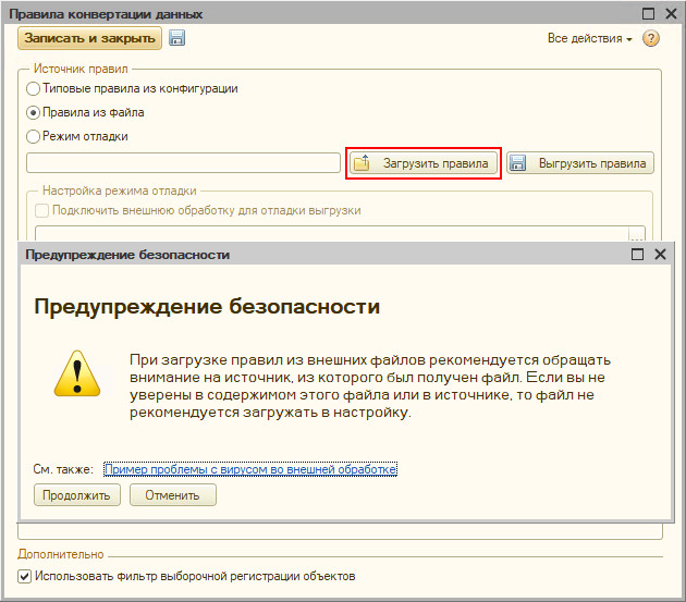 В форме устанавливаем в списке "Источник правил" на "Правила из файла". Нажимаем кнопку "Загрузить правила". Соглашаемся с предупреждением безопасности.