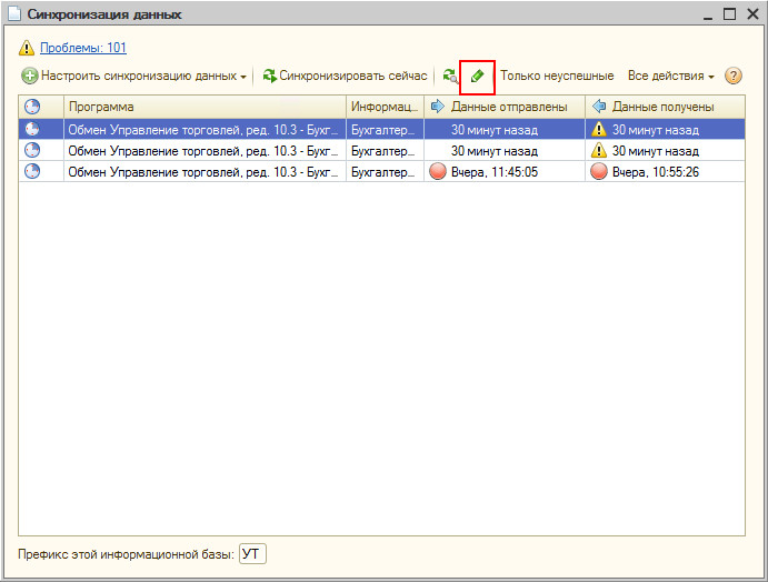 Если у Вас в базе настроено несколько обменов/выгрузок в базы Бухгалтерии редакции 3.0, то кнопка изменения/открытия формы настройки будет доступна в виде иконки кнопки "Изменить параметры синхронизации данных" на командной панели списка. И так же откроется форма, как показано на рис. 2 выше - "Эта информационная база", в которой переходим к меню "Параметры синхронизации данных".