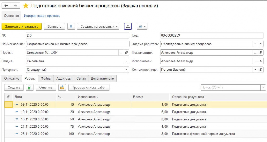 - Отметки о работе вносятся прямо в задаче, без лишних переходов между окнами.