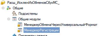 - Далее для исключения из "Регистрации объектов на обмен" были добавлены процедуры модуля "МенеджерРегистрации" этой же конфигурации в это же расширение.