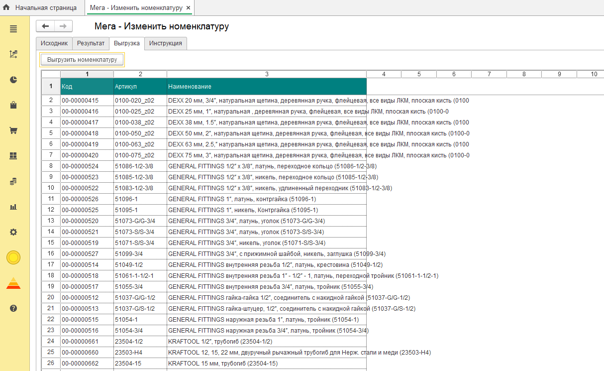 - Часто перед пользователями 1С возникает задача массового изменения номенклатуры — по разным причинам. В типовых конфигурациях удобных штатных инструментов для этого нет. Самый распространённый запрос: выгрузить номенклатуру, отредактировать наименования (например, в Excel) и загрузить обратно.