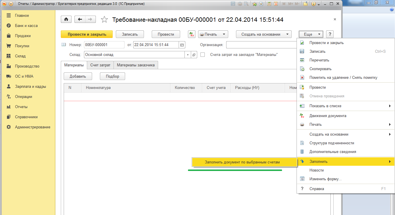 Обработка заполняет документ "Требование-накладная" имеющимися остатками по указанным вами счетам учета ТМЦ.