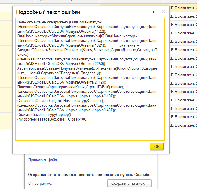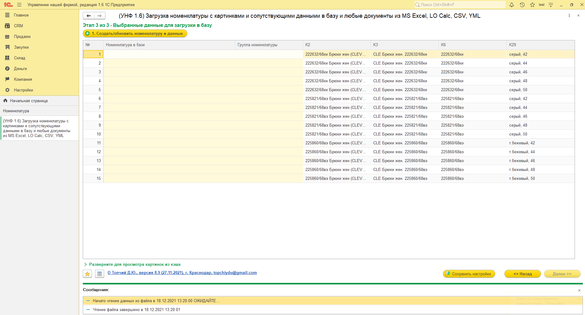 Добавлен механизм проверки наличия необходимых объектов конфигурации для работы обработки при открытии обработки во все версии. Если вы получаете окно с информацией при запуске, то скорее всего вы используете устаревшую версию обработки и нужно получить более свежую версию обработки, с исправлениями для новой конфигурации. Добавлена возможность загрузки файла с комбинированным расположением картинок. Теперь в одной колонке можно располагать как и непосредственно картинки (вставленные картинки в ячейки), так и ссылками на файлы или данные в интернете. Исправлена ошибка при загрузке упаковок в Рознице при создании новой номенклатуры. Исправлена ошибка при загрузке характеристик в УНФ 3.0 и Розница 3.0 и старше. Теперь чтоб привязать характеристики к номенклатуре при загрузке, нужно установить в реквизите номенклатуры "Привязать характеристики к номенклатуре при загрузке" "Да". Если нужно привязать характеристики к категории номенклатуры, то данный реквизит нужно установить в "Нет" при загрузке номенклатуры и изменить флаг непосредственно в нужной категории номенклатуры (виде) и выполнить загрузку. Настойки лучше сделать с нуля. Исправлена ошибка при загрузке серий в УНФ 3.0 и Розница 3.0 и старше. Теперь чтоб привязать серии к номенклатуре при загрузке, нужно установить в реквизите номенклатуры "Привязать серии к номенклатуре при загрузке" "Да". Если нужно привязать серии к категории номенклатуры, то данный реквизит нужно установить в "Нет" при загрузке номенклатуры и изменить флаг непосредственно в нужной категории номенклатуры (виде) и выполнить загрузку. Настойки лучше сделать с нуля. Исправлена ошибка в обработках для УТ 11 в плане выбора табличной части "Товары" или "Товары 2.5" если используется новое ценообразование. Теперь, если включено новое ценообразование, то табличная часть "Товары" при установке цен в списке выбора будет скрыта, отображаться будет только "Товары 2.5". И наоборот. Исправлена логика работы с соответствием при сопоставлении колонок. Теперь нужно всегда сперва указать колонку или список колонок в реквизите (через перетаскивание колонки на реквизит как и было), а уже потом нажать на "Соответствие" и система заполнит автоматом список колонок и без дублей. Перезаполнять больше нет нужны. Это справедливо и для реквизита "Цена" при загрузке цен номенклатуры.