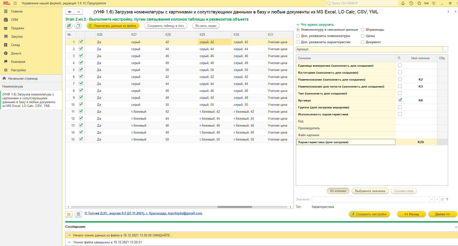 - Предварительное считывание данных из файла и интерактивное связывание колонок данных из файла и реквизитов из базы объектов, которые будут создаваться. Связывание происходит методом перетаскивания колонки файла на нужный реквизит или указанием имени колонки из файла, путем ввода номера колонки в виде «к1» или «K2» на английском или на русском, система все «подгонит» как надо!